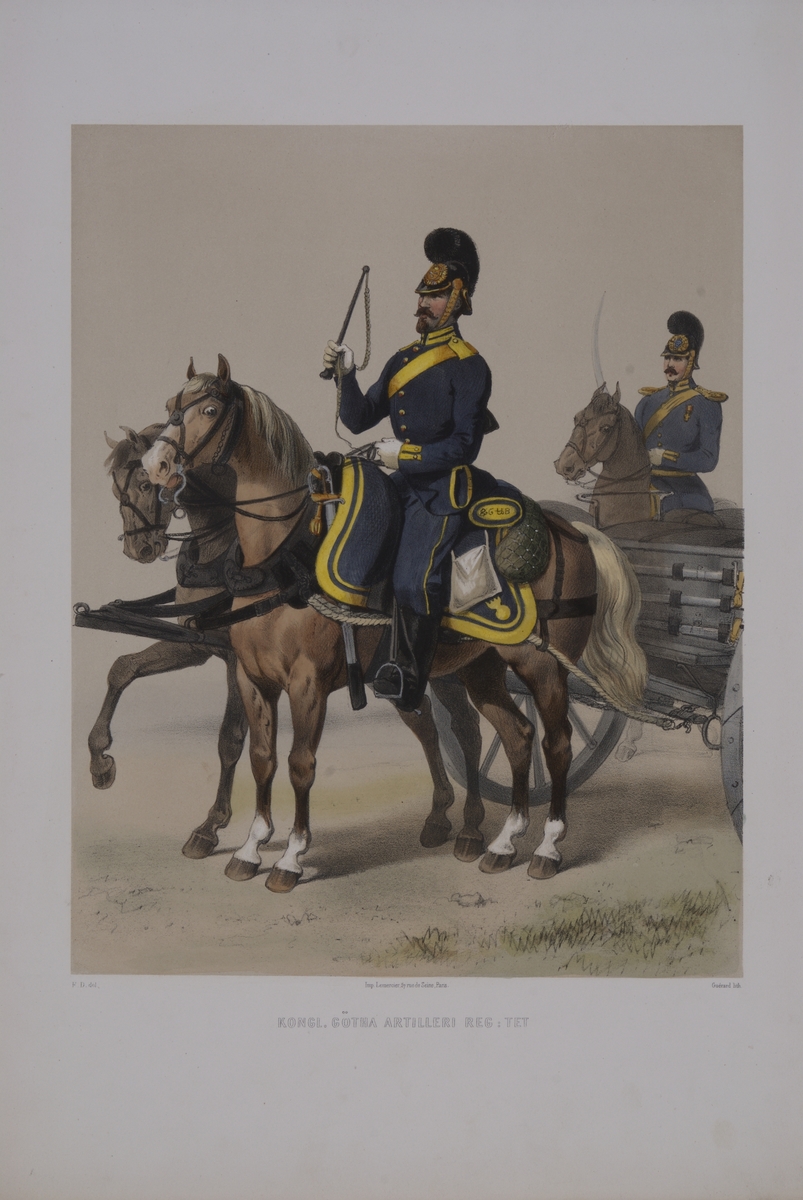 Plansch med uniform för Göta artilleriregemente. Plansch i färgtryck efter original av Fritz von Dardel. Ingår i planschsamlingen Den svenska och norske armeens uniformer, 1861-1863.