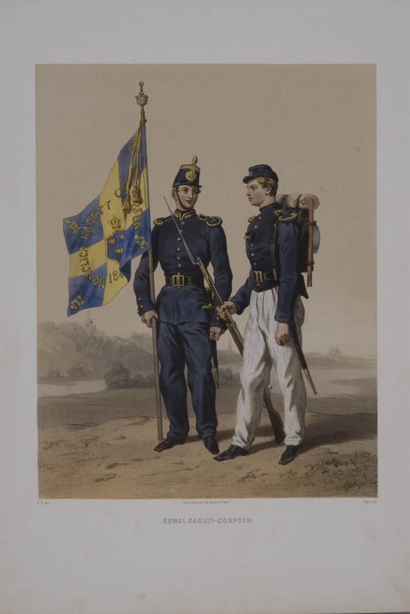 Plansch med uniform för Kadettkåren. Plansch i färgtryck efter original av Fritz von Dardel. Ingår i planschsamlingen Den svenska och norske armeens uniformer, 1861-1863.
