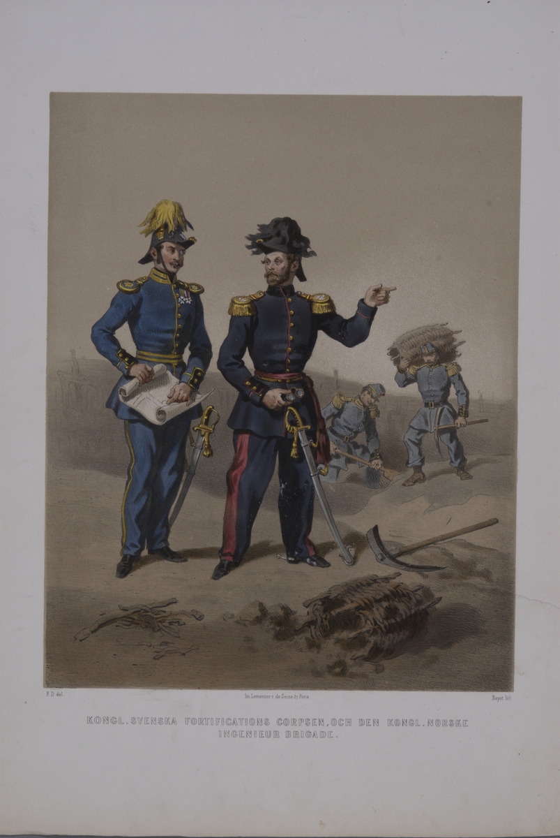 Plansch med uniform för Svenska fortifikationskåren och Norska ingenjör brigaden. Plansch i färgtryck efter original av Fritz von Dardel. Ingår i planschsamlingen Den svenska och norske armeens uniformer, 1861-1863.