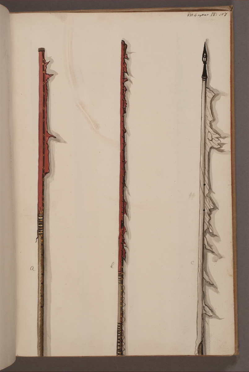 Avbildning i gouache föreställande fanstänger tagna som troféer av svenska armén. Den vänstra fanstången finns bevarad i Armémuseums samling, för mer information, se relaterade objekt.