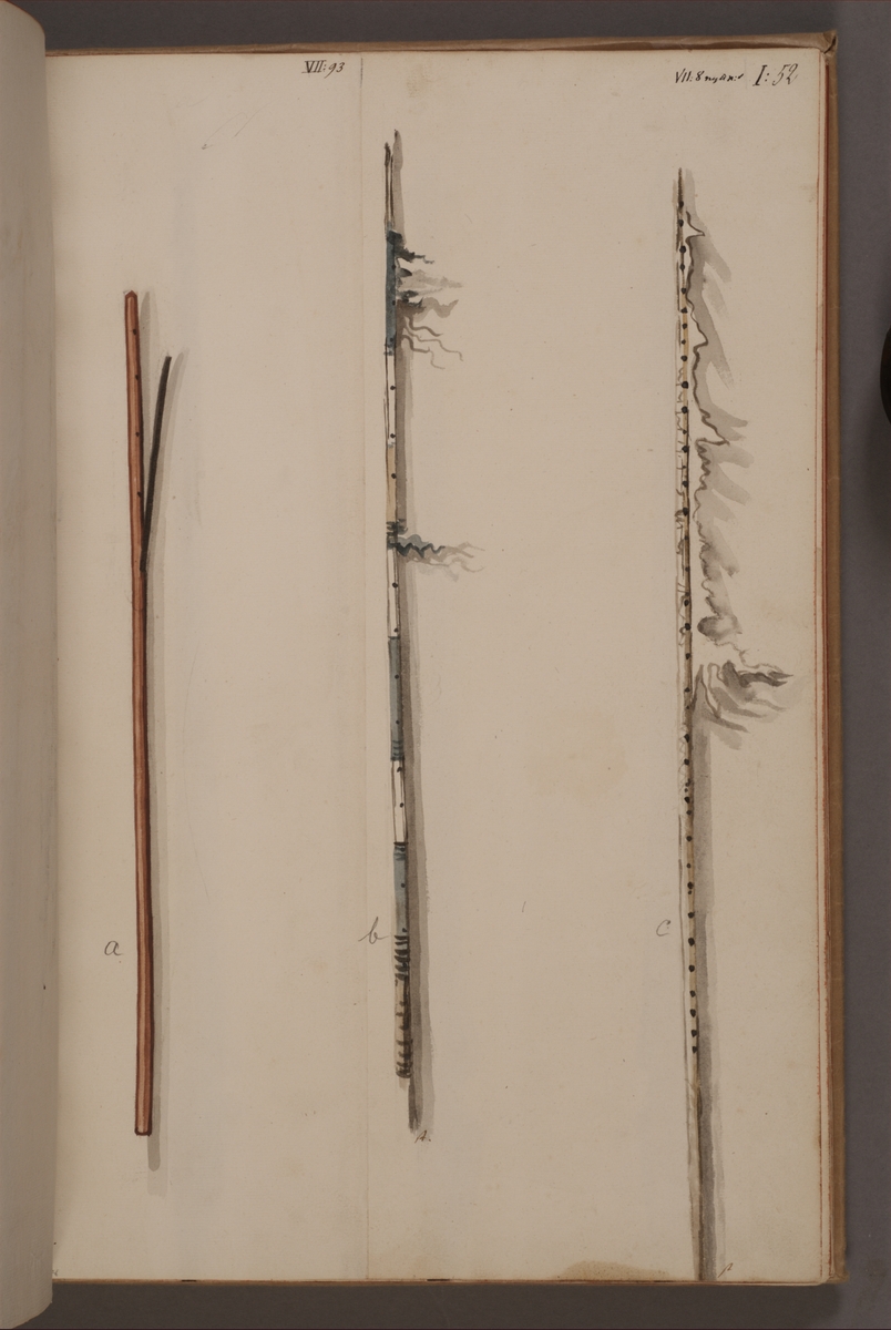 Avbildning i gouache föreställande fanstänger tagna som troféer av svenska armén. Fanstången i mitten finns bevarad i Armémuseums samling, för mer information, se relaterade objekt.
