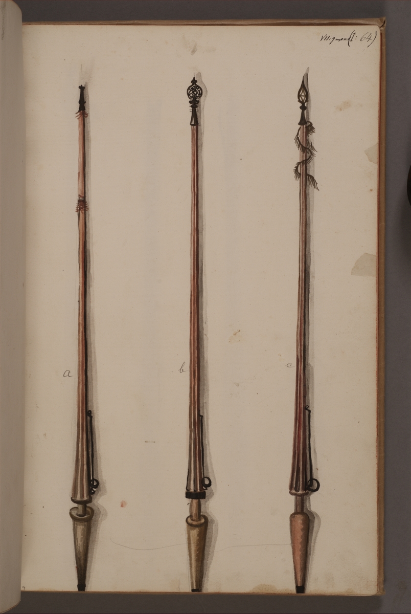 Avbildning i gouache föreställande standarstänger tagna som troféer av svenska armén. De avbildade objekten finns bevarade i Armémuseums samling, för mer information, se relaterade objekt.