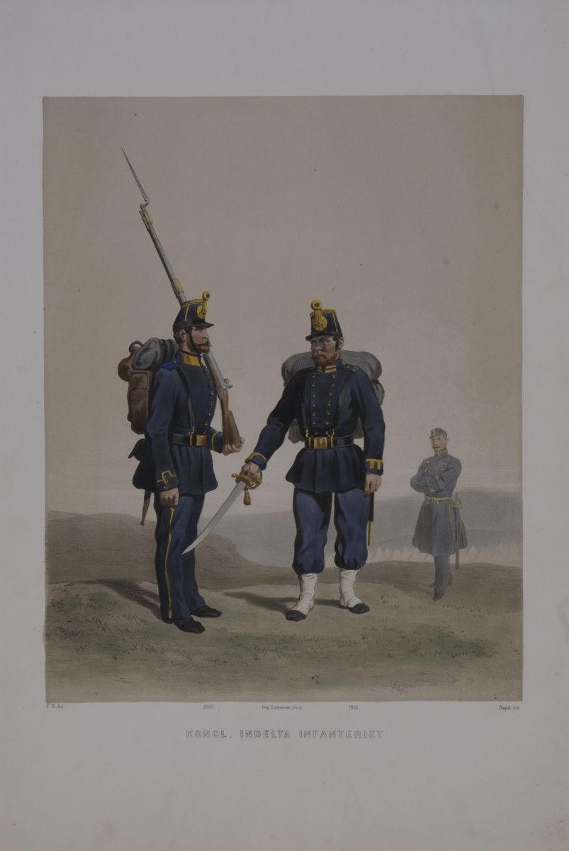 Plansch med uniform för Indelta infanteri. Plansch i färgtryck efter original av Fritz von Dardel. Ingår i planschsamlingen Den svenska och norske armeens uniformer, 1861-1863.