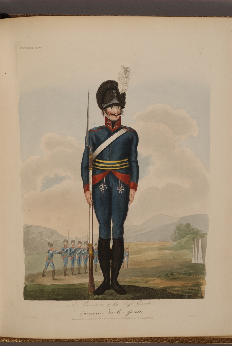 Plansch med uniform för Livgrenadjärregementet, ritad av Frederic Eben i boken The Swedish Army, utgiven 1808.
