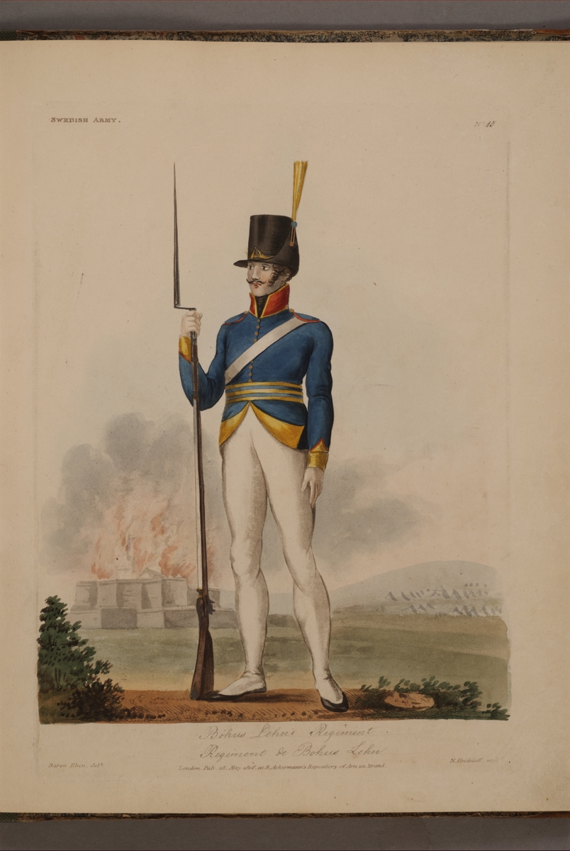 Plansch med uniform för Bousläns regemente, ritad av Frederic Eben i boken The Swedish Army, utgiven 1808.