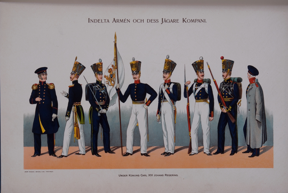 Plansch med uniform för indelta armén och dess jägarkompani under Karl XIV Johans regering. Ingår i boken Svenska krigsmakten under konungarna Carl XIV Johan, Oscar I, Karl XV, Oscar II, utgiven av P.B. Eklund.