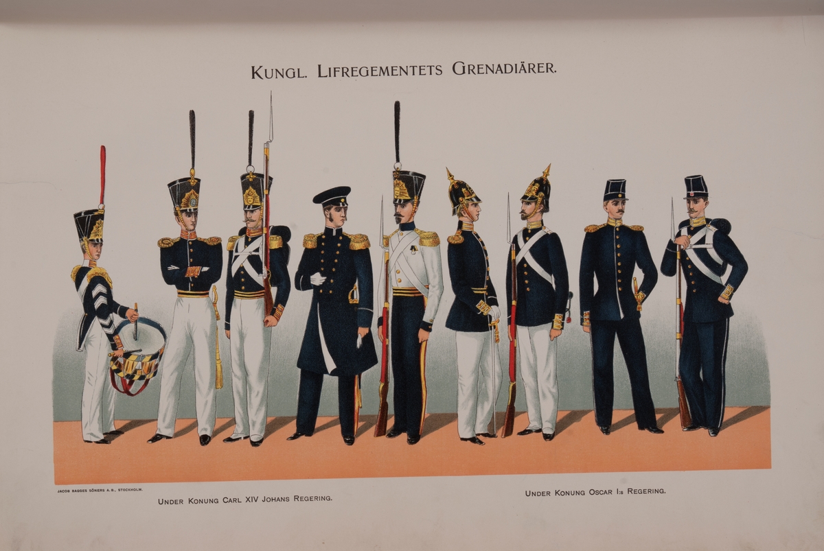 Plansch med uniform för Livregementets grenadjärer under Karl XIV Johans regering och Oscar I regering. Ingår i boken Svenska krigsmakten under konungarna Carl XIV Johan, Oscar I, Karl XV, Oscar II, utgiven av P.B. Eklund.