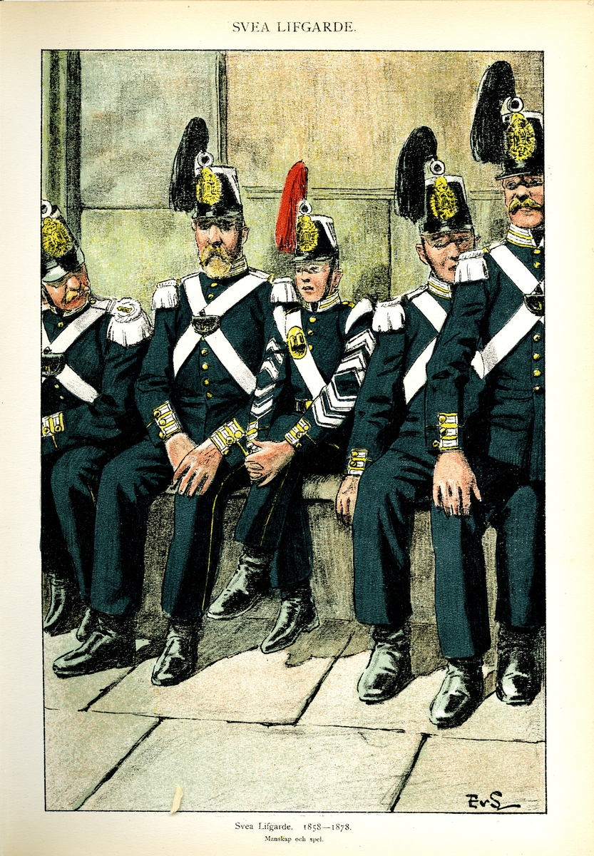 Plansch med uniform för manskap och spel vid Svea livgarde för åren 1858-1978, ritad av Einar von Strokirch. Ingår i planschsamlingen Svenska arméns munderingar 1680-1905.