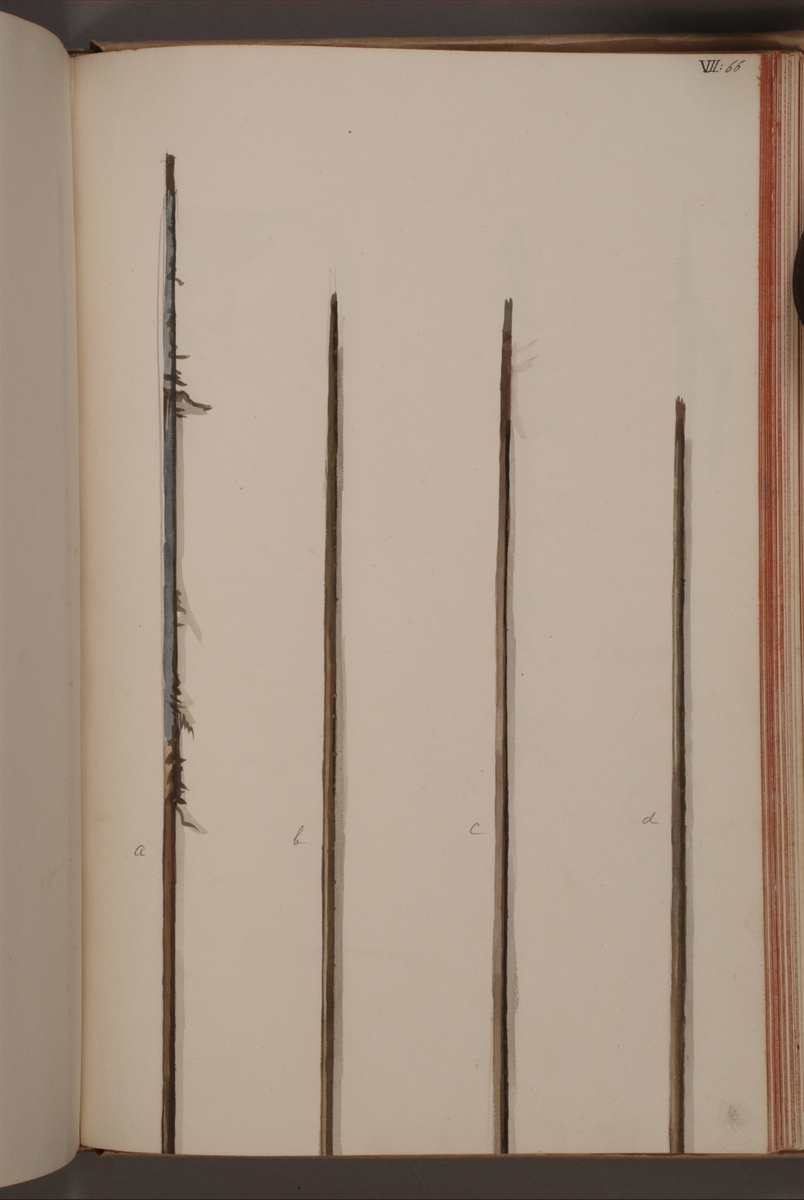 Avbildning i gouache föreställande fanstänger tagna som troféer av svenska armén. De avbildade stängerna finns inte bevarade i Armémuseums samling.