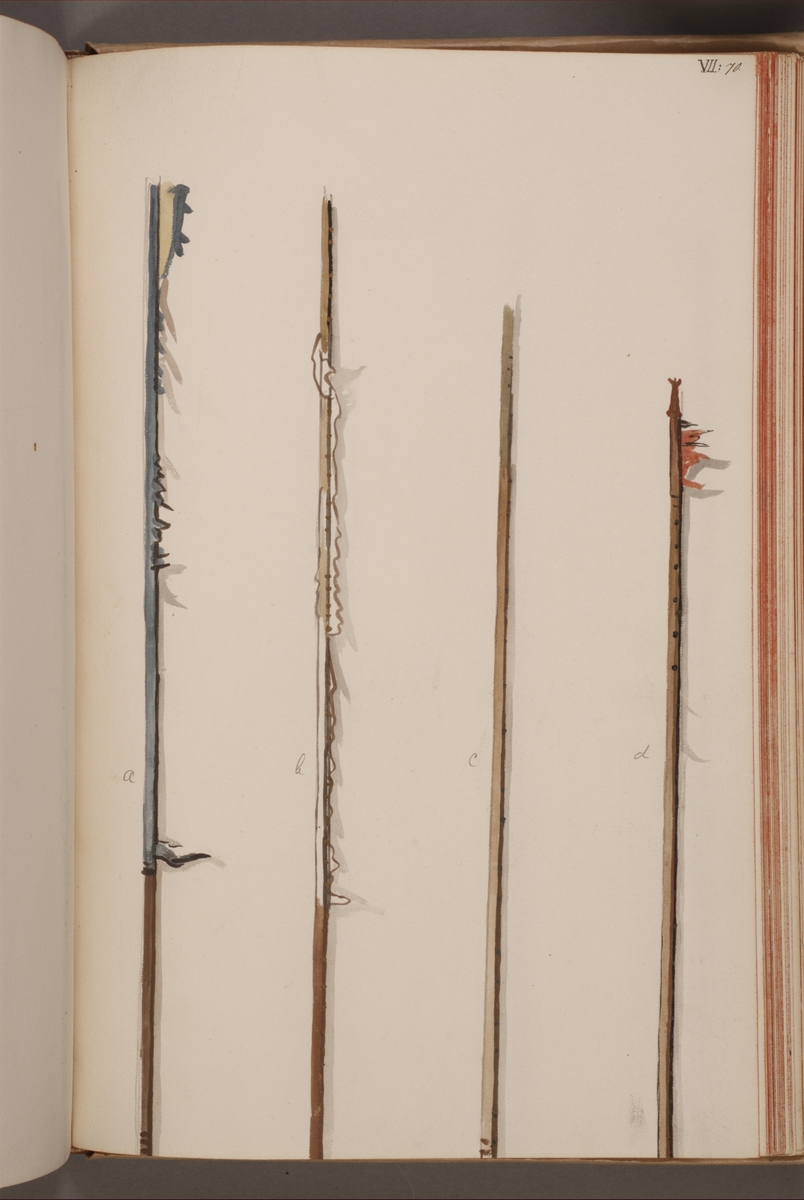 Avbildning i gouache föreställande fanstänger tagna som troféer av svenska armén. Stången längst till vänster i bild finns bevarad i Armémuseums samling, för mer information, se relaterade objekt.