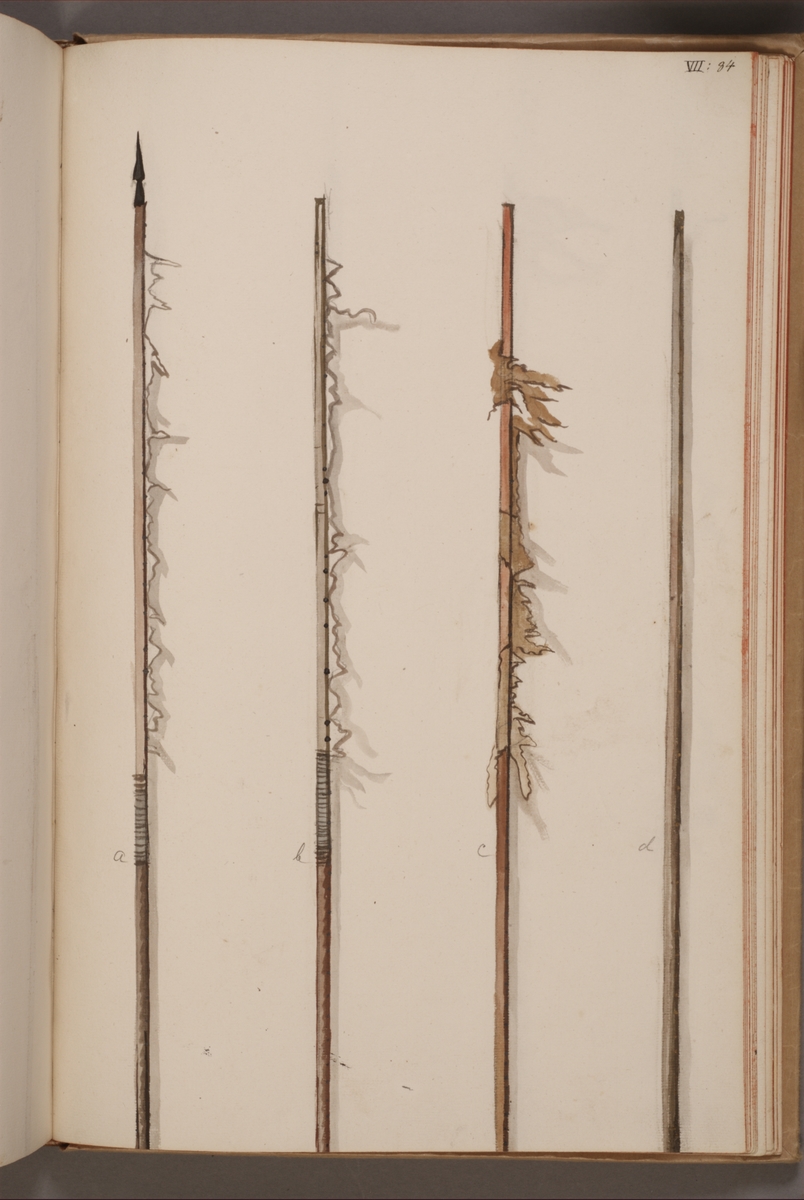 Avbildning i gouache föreställande fanstänger tagna som troféer av svenska armén. Stången näst längst till höger i bild finns bevarad i Armémuseums samling, för mer information, se relaterade objekt.