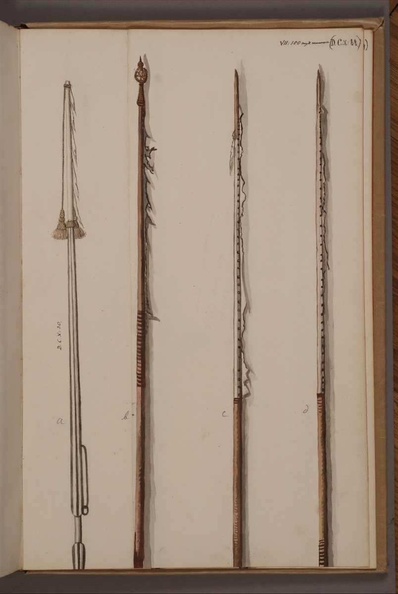 Avbildning i gouache föreställande standar- och fanstänger tagna som troféer av svenska armén. De avbildade stängerna finns inte bevarade i Armémuseums samling.