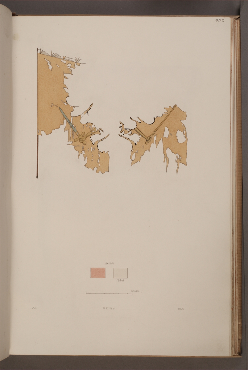 Avbildning i gouache föreställande fana tagen som trofé av svenska armén. Bilden visar troligen en bevarad fana i Armémuseums samling, för mer information, se relaterade objekt.