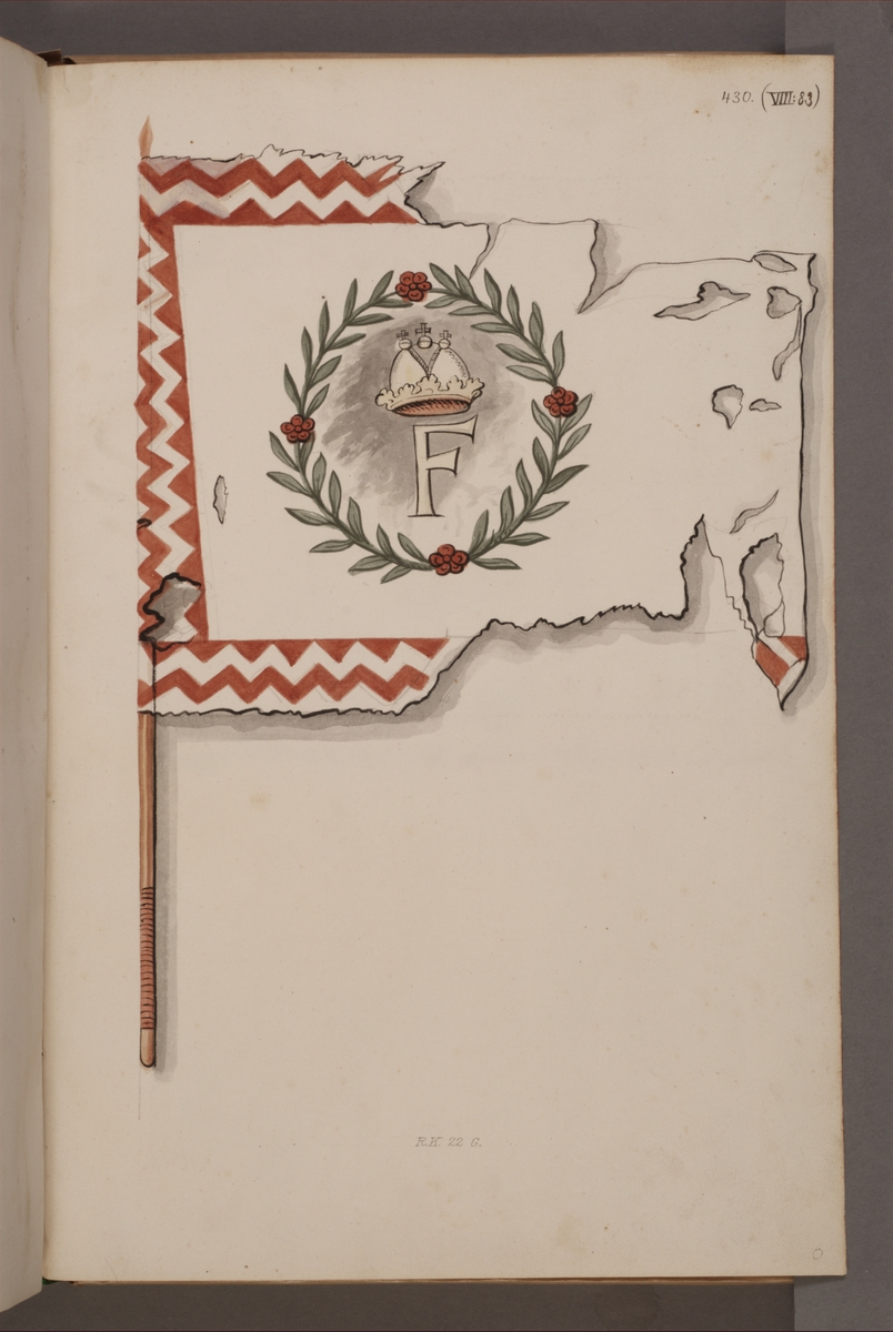 Titel: Avbildning i gouache föreställande fana tagen som trofé av svenska armén. Den avbildade fanan finns delvis bevarad i Armémuseums samling, för mer information, se relaterade objekt.