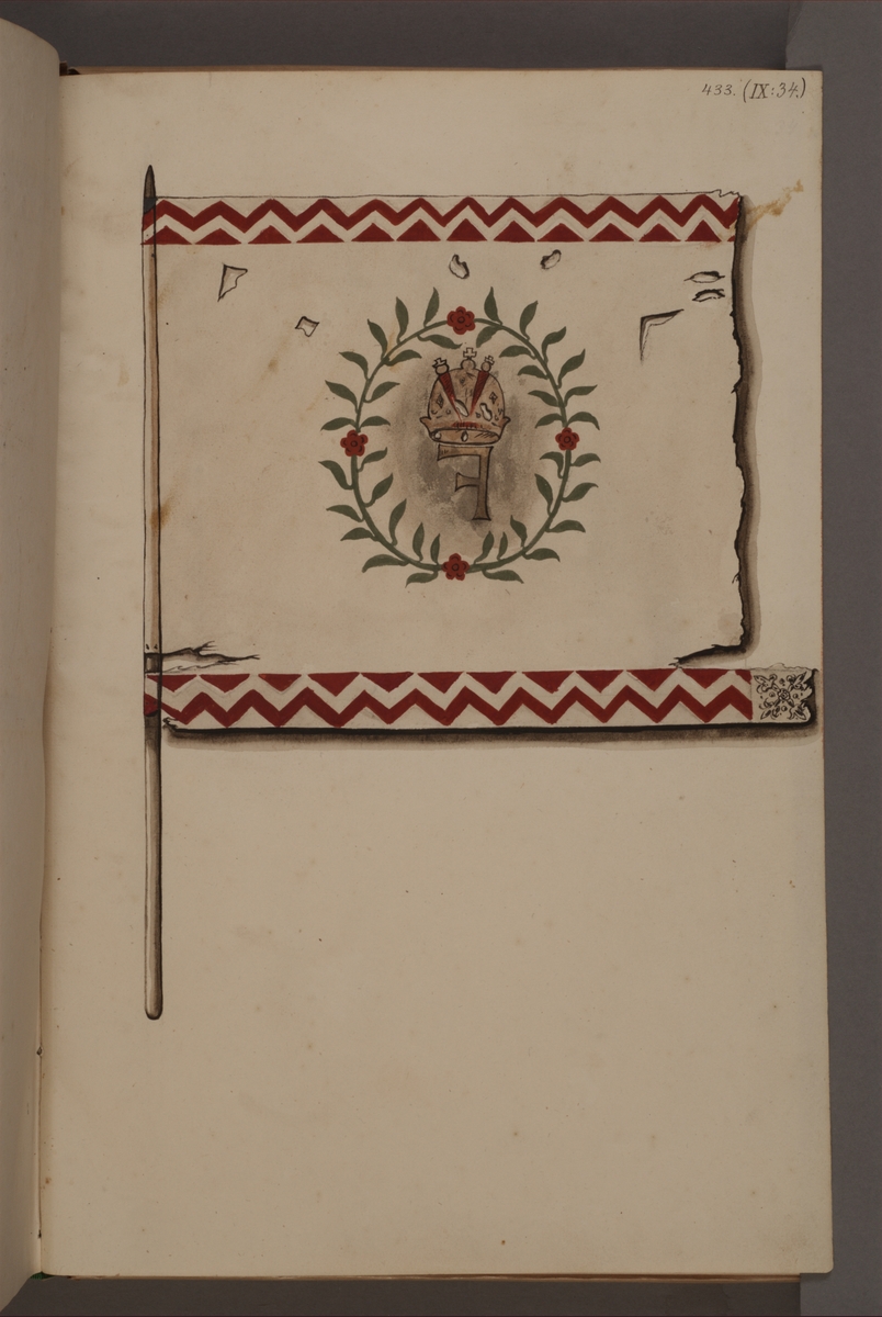 Avbildning i gouache föreställande fana tagen som trofé av svenska armén. Den avbildade fanan finns inte bevarad i Armémuseums samling, för mer information.