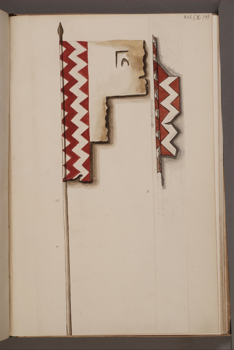 Avbildning i gouache föreställande fanor tagna som troféer av svenska armén. De avbildade fanorna finns delvis bevarad i Armémuseums samling, för mer information, se relaterade objekt.