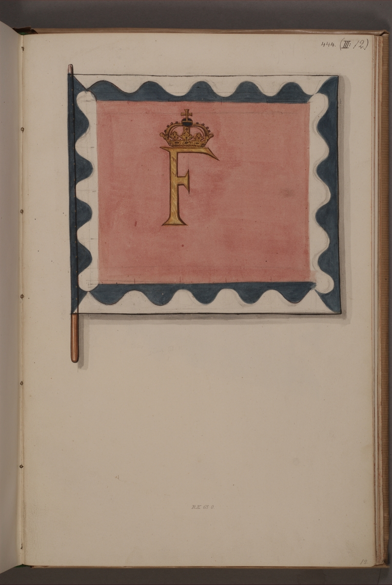 Avbildning i gouache föreställande fana tagen som trofé av svenska armén. Den avbildade fanan finns bevarad i Armémuseums samling, för mer information, se relaterade objekt.