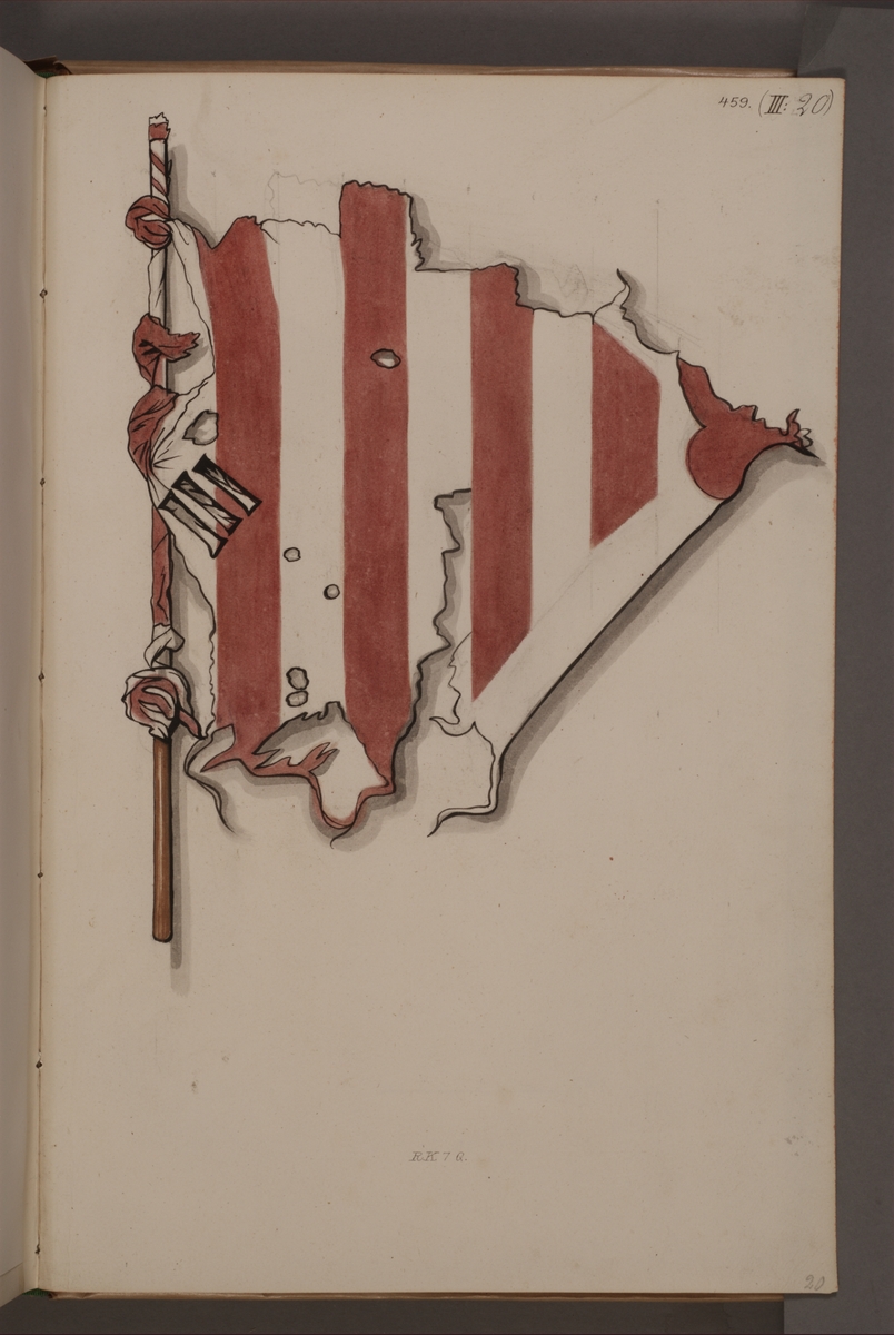 Avbildning i gouache föreställande fana tagen som trofé av svenska armén. Den avbildade fanan finns inte.
