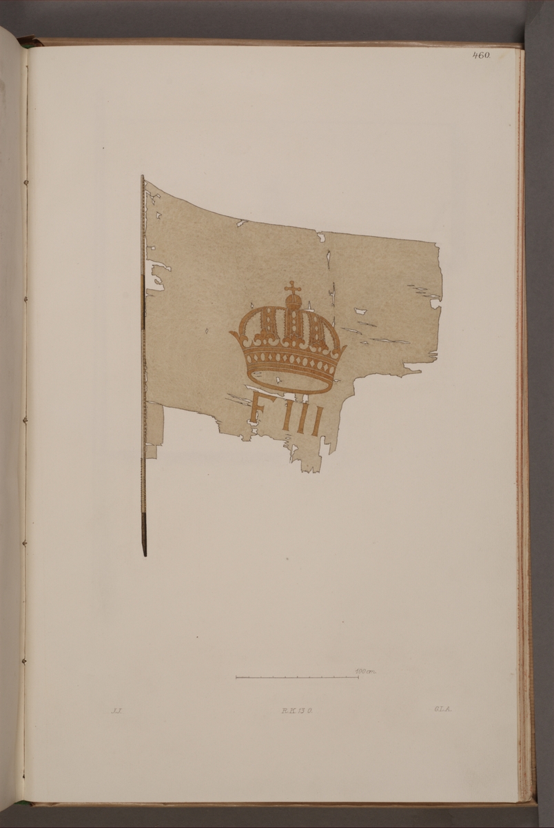 Avbildning i gouache föreställande fana tagen som trofé av svenska armén. Den avbildade fanan finns bevarad i Armémuseums samling, för mer information, se relaterade objekt.