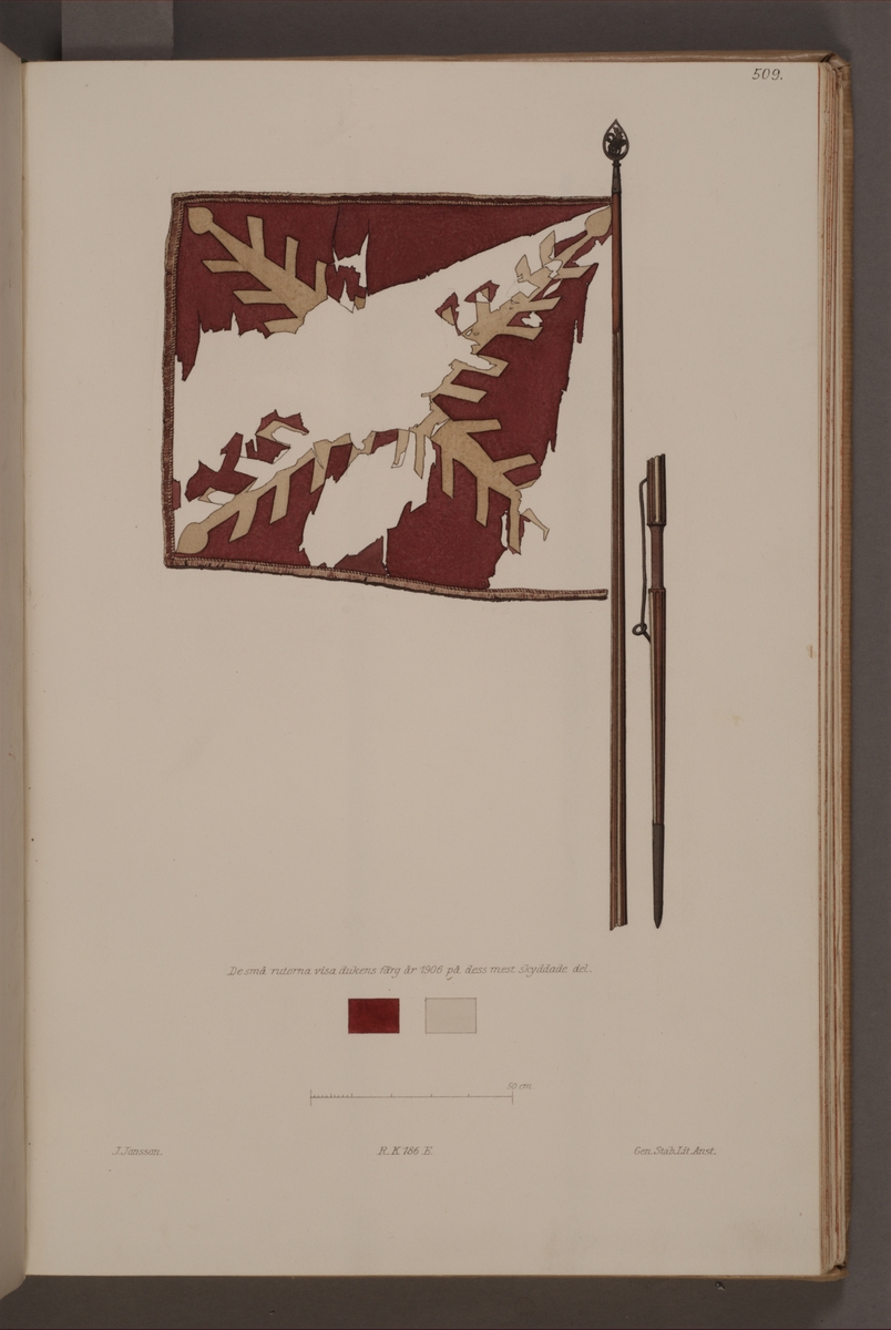 Avbildning i gouache föreställande fälttecken taget som trofé av svenska armén. Det avbildade standaret finns bevarat i Armémuseums samling, för mer information, se relaterade objekt.