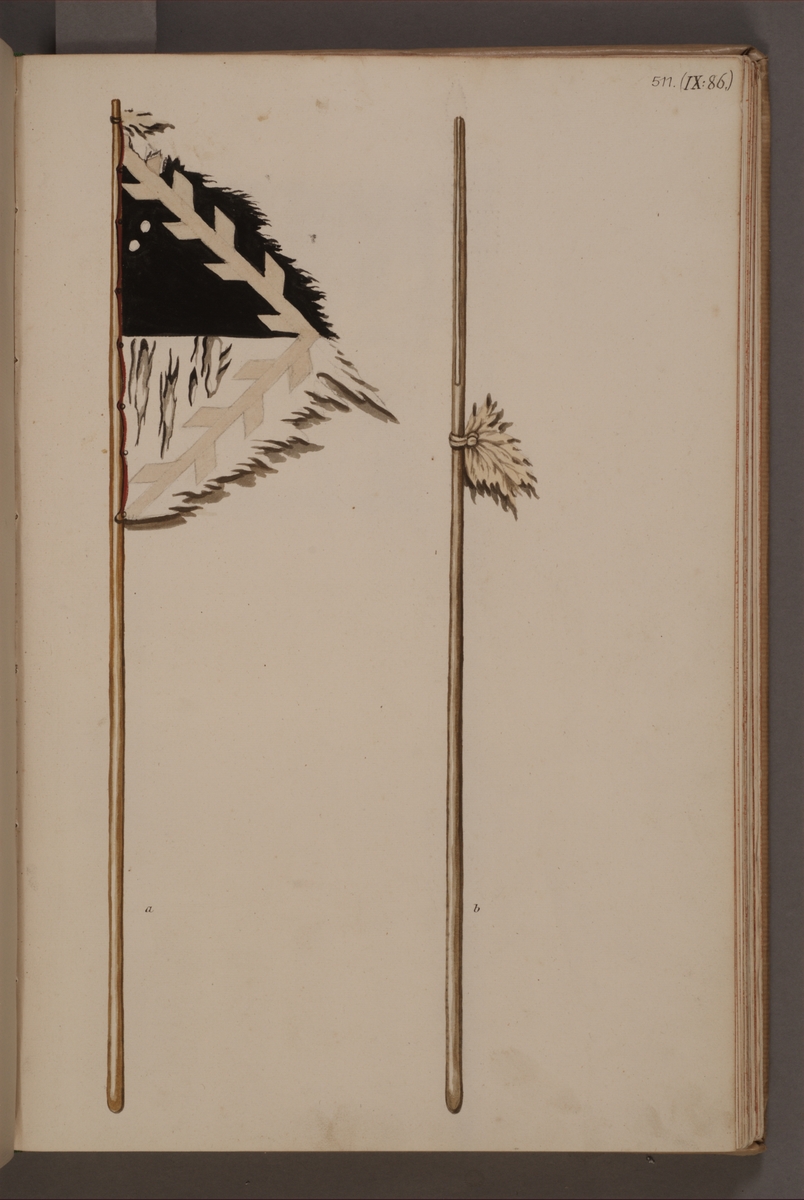 Avbildning i gouache föreställande fälttecken tagna som trofé av svenska armén. De avbildade standaren finns inte bevarade i Armémuseums samling.