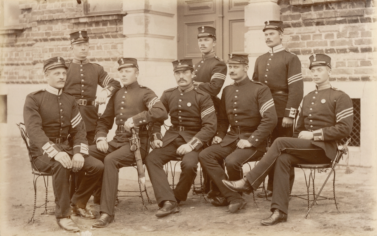 Elever vid Volontärskolan sitter utanför kasernbyggnad.