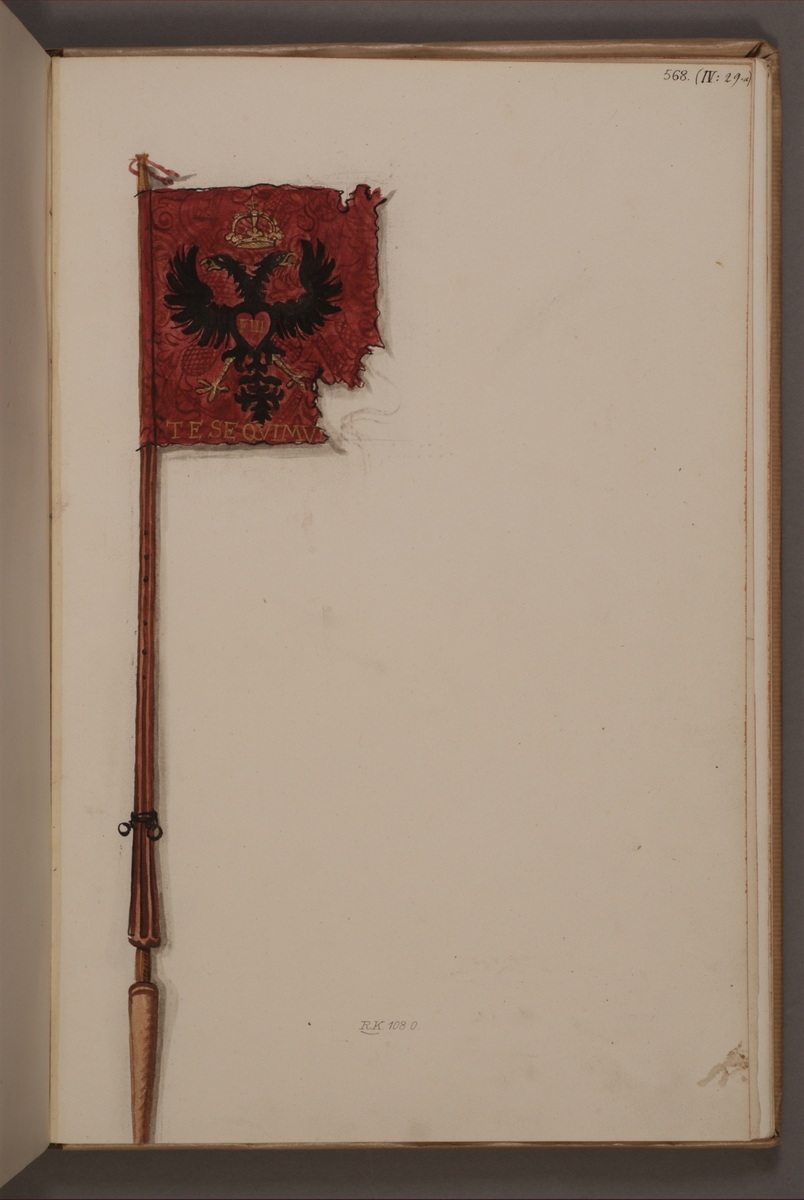 Titel: Avbildning i gouache föreställande fälttecken taget som trofé av svenska armén. Det avbildade standaret finns bevarat i Armémuseums samling.