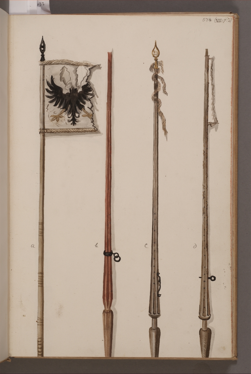 Avbildning i gouache föreställande fälttecken tagna som trofé av svenska armén. Stängerna längst till höger och näst längst till vänster i bild finns bevarade i Armémuseums samling, för mer information, se relaterade objekt.