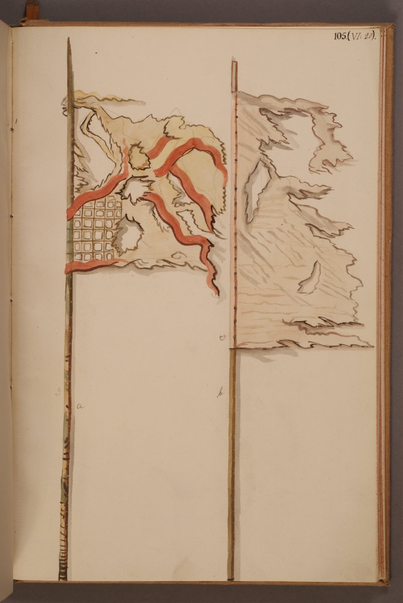 Avbildning i gouache föreställande fälttecken tagna som troféer av svenska armén. De avbildade fanorna finns inte bevarade i Armémuseums samling.