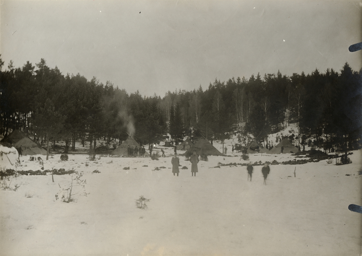 Tältläger i vinterlandskap.