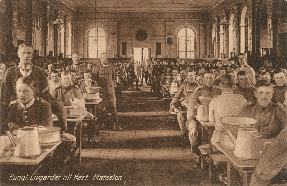 Titel: Soldater från Livgardet till häst har matpaus i regementets matsal.