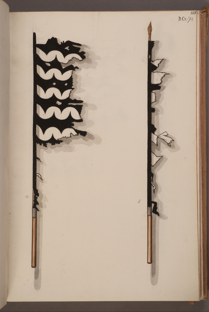 Avbildning i gouache föreställande fälttecken tagna som troféer av svenska armén. De avbildade fanorna finns bevarade i Armémuseums samling, för mer information, se relaterade objekt.