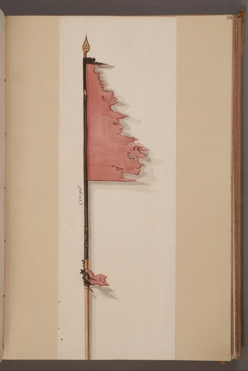 Titel: Avbildning i gouache föreställande fälttecken taget som trofé av svenska armén. Den avbildade fanan finns inte bevarad i Armémuseums samling.
