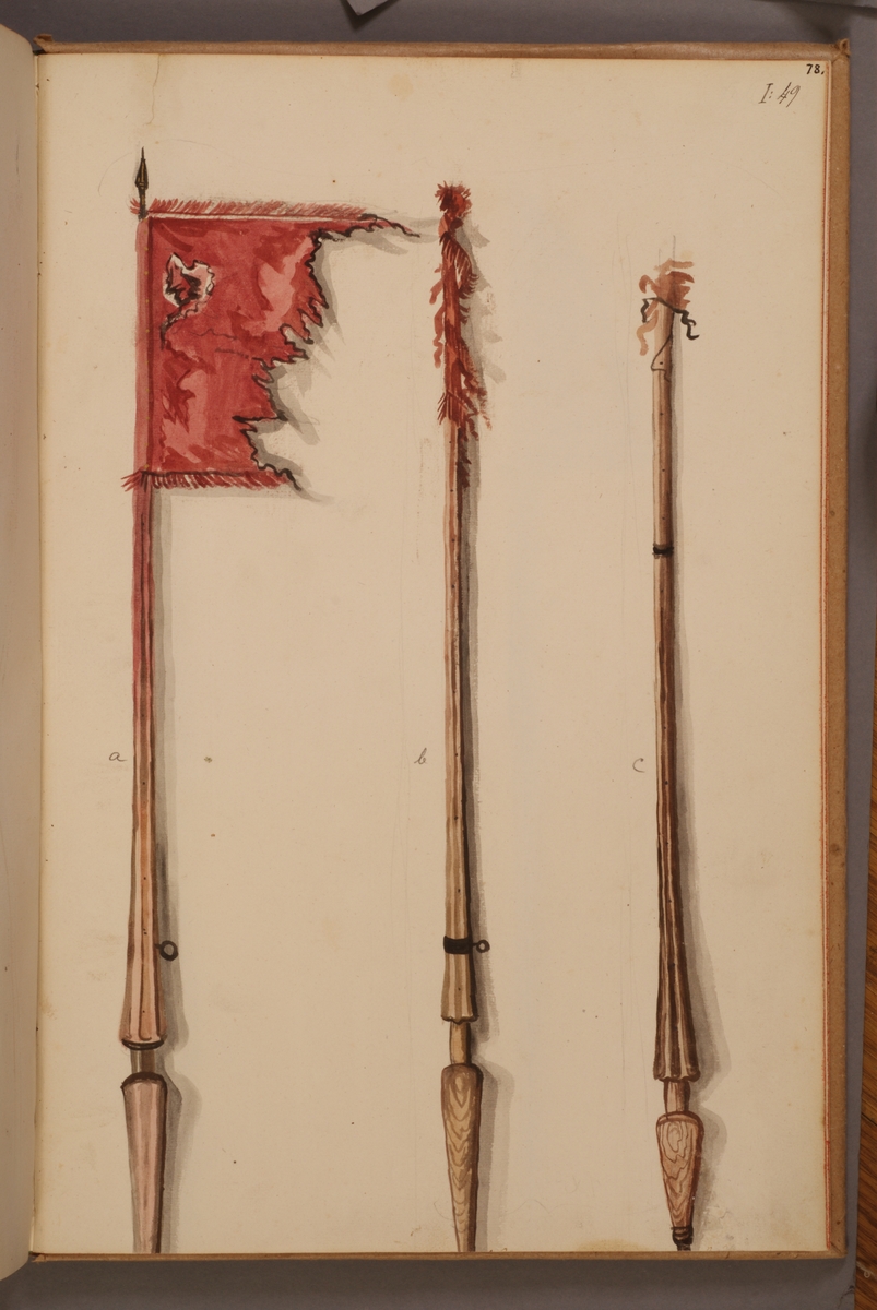 Avbildning i gouache föreställande fälttecken tagna som troféer av svenska armén. De avbildade standaren finns inte bevarade i Armémuseums samling.