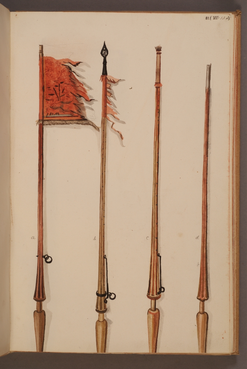 Avbildning i gouache föreställande fälttecken tagna som troféer av svenska armén. Standaret längst till vänster i bild finns bevarat i Armémuseums samling, för mer information, se relaterade objekt.