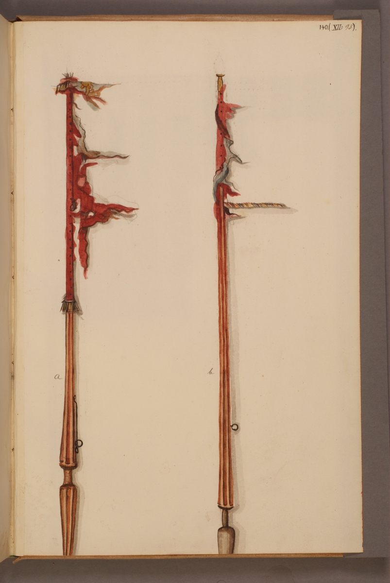 Avbildning i gouache föreställande fälttecken tagna som troféer av svenska armén. De avbildade standaren finns inte bevarade i Armémuseums samling.