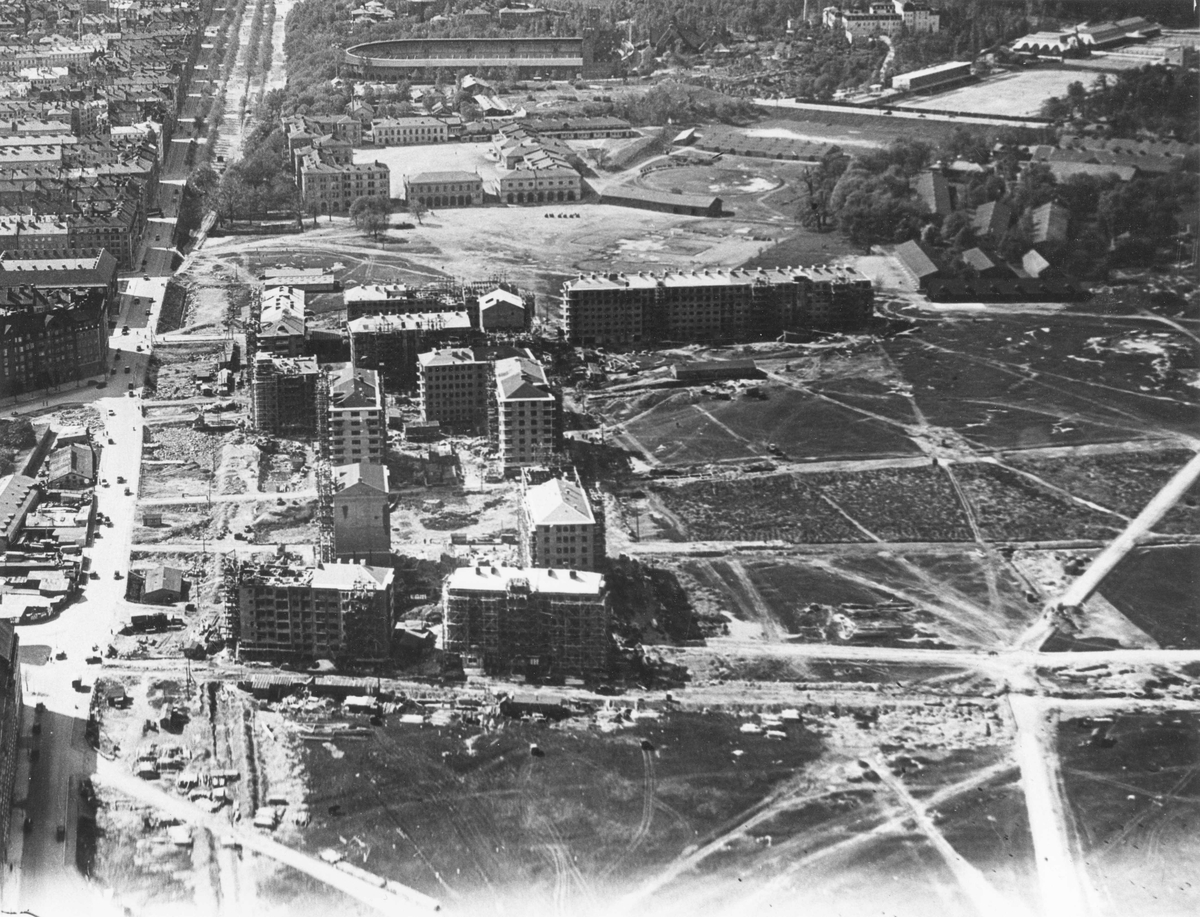 Flygbild över byggnationen av Gärdet, Stockholm på 1930-talet.
