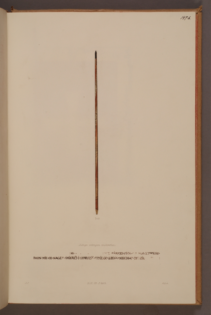 Avbildning i gouache föreställande fanstång till fälttecken taget som trofé av svenska armén. Den avbildade stången finns bevarad i Armémuseums samling, för mer information, se relaterade objekt.