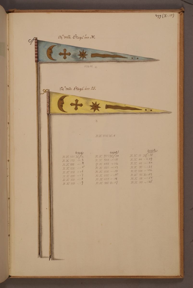 Avbildning i gouache föreställande fälttecken tagna som troféer av svenska armén. De avbildade lansfanorna finns bevarade i Armémuseums samling, för mer information, se relaterade objekt.
