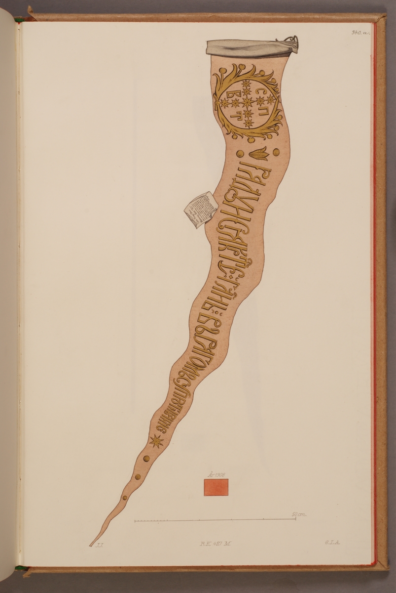Avbildning i gouache föreställande fälttecken taget som trofé av svenska armén. Den avbildade lansfanan finns bevarad i Armémuseums samling, för mer information, se relaterade objekt.