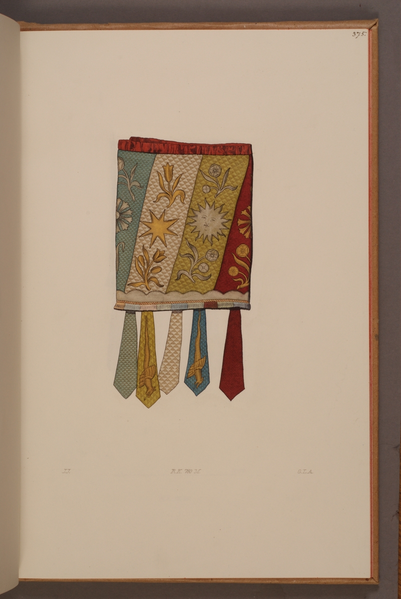 Titel: Avbildning i gouache föreställande fälttecken taget som trofé av svenska armén. Det avbildade fälttecknet, så kallad tjechol, finns bevarat i Armémuseums samling, för mer information, se relaterade objekt.