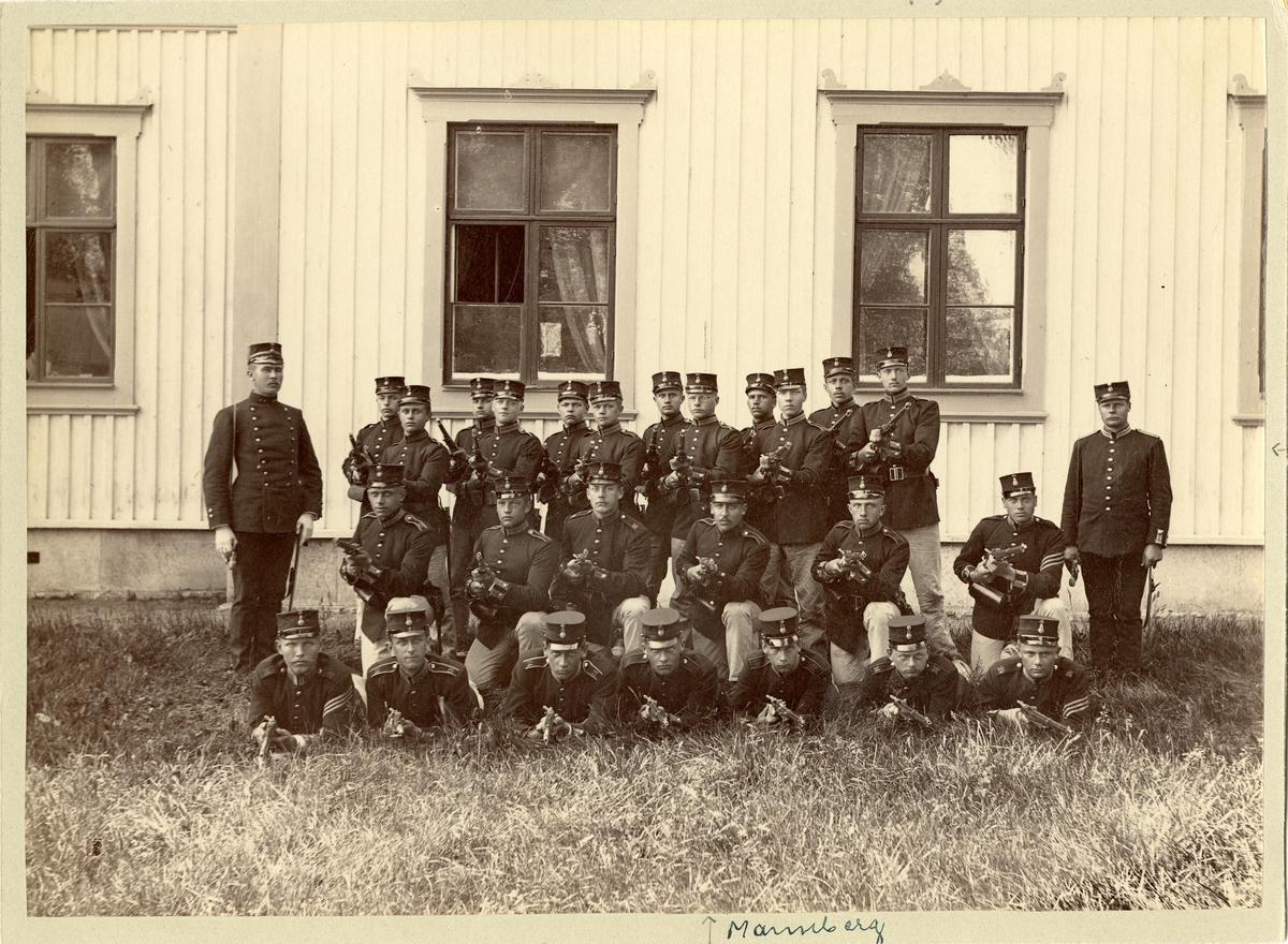 Grupporträtt av befäl och elever vid 1:a pluton av 1:a kompaniet vid infanterivolontärskola på Karlsborg 1893-1894.