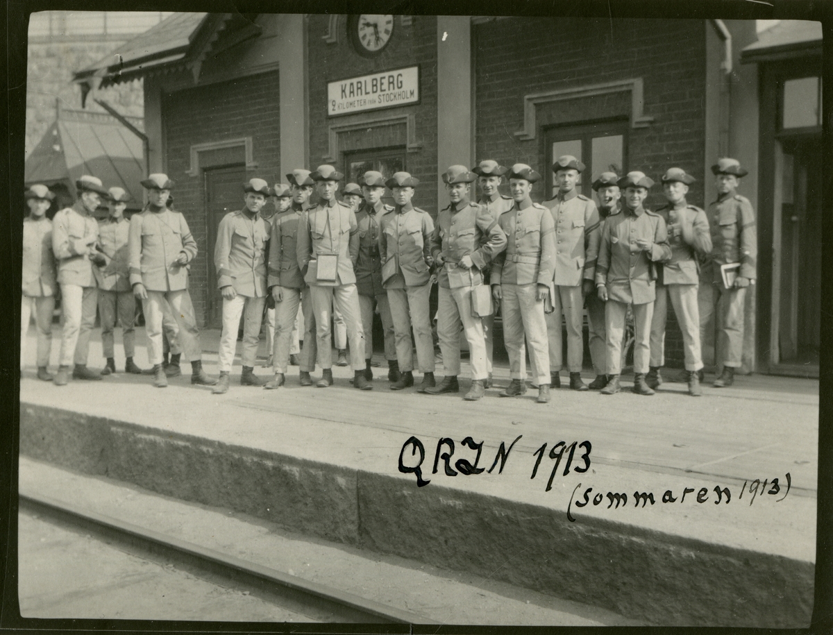Titel: Kadetter ur 2:a pluton studentkompaniet samlade på Karlbergs station sommaren 1913