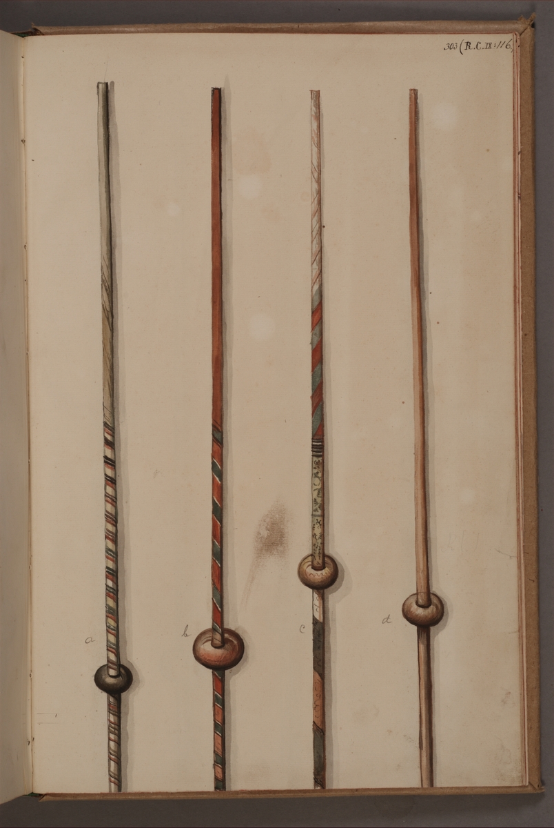 Avbildning i gouache föreställande fanstänger tagna som troféer av svenska armén. Stången näst längst till höger i bild finns bevarad i Armémuseums samling, för mer information, se relaterade objekt.