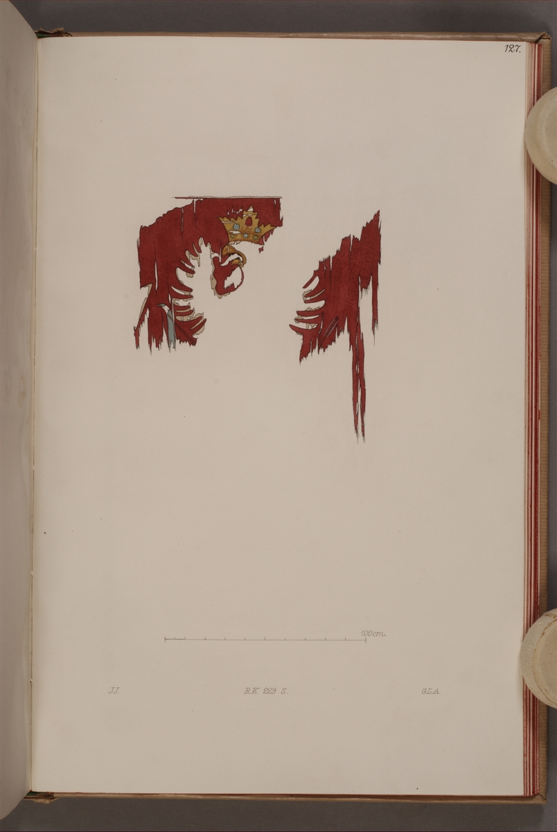 Titel: Avbildning i gouache föreställande fälttecken taget som trofé av svenska armén. Den avbildade fanan finns bevarad i Armémuseums samling, för mer information, se relaterade objekt.