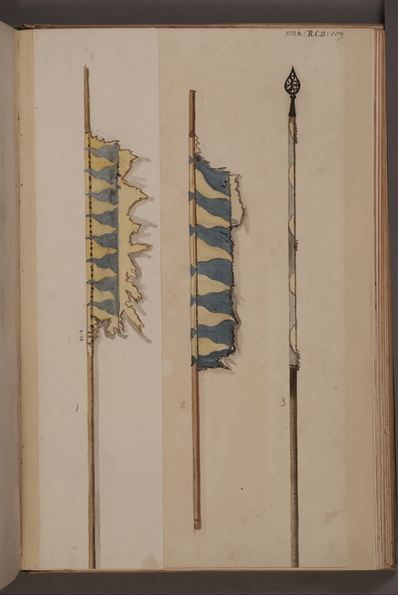 Avbildning i gouache föreställande fanor tagna som troféer av svenska armén. De avbildade fanorna finns inte bevarade i Armémuseums samling.