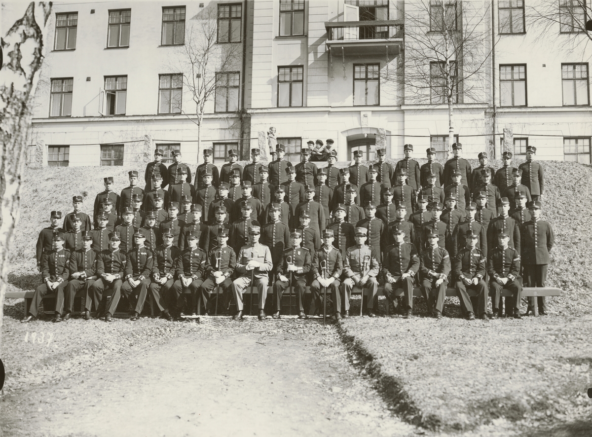 Gruppbild av soldater och officerare från Göta livgarde I 2 utanför kasernbyggnad. I bakgrunden sitter fyra barn.