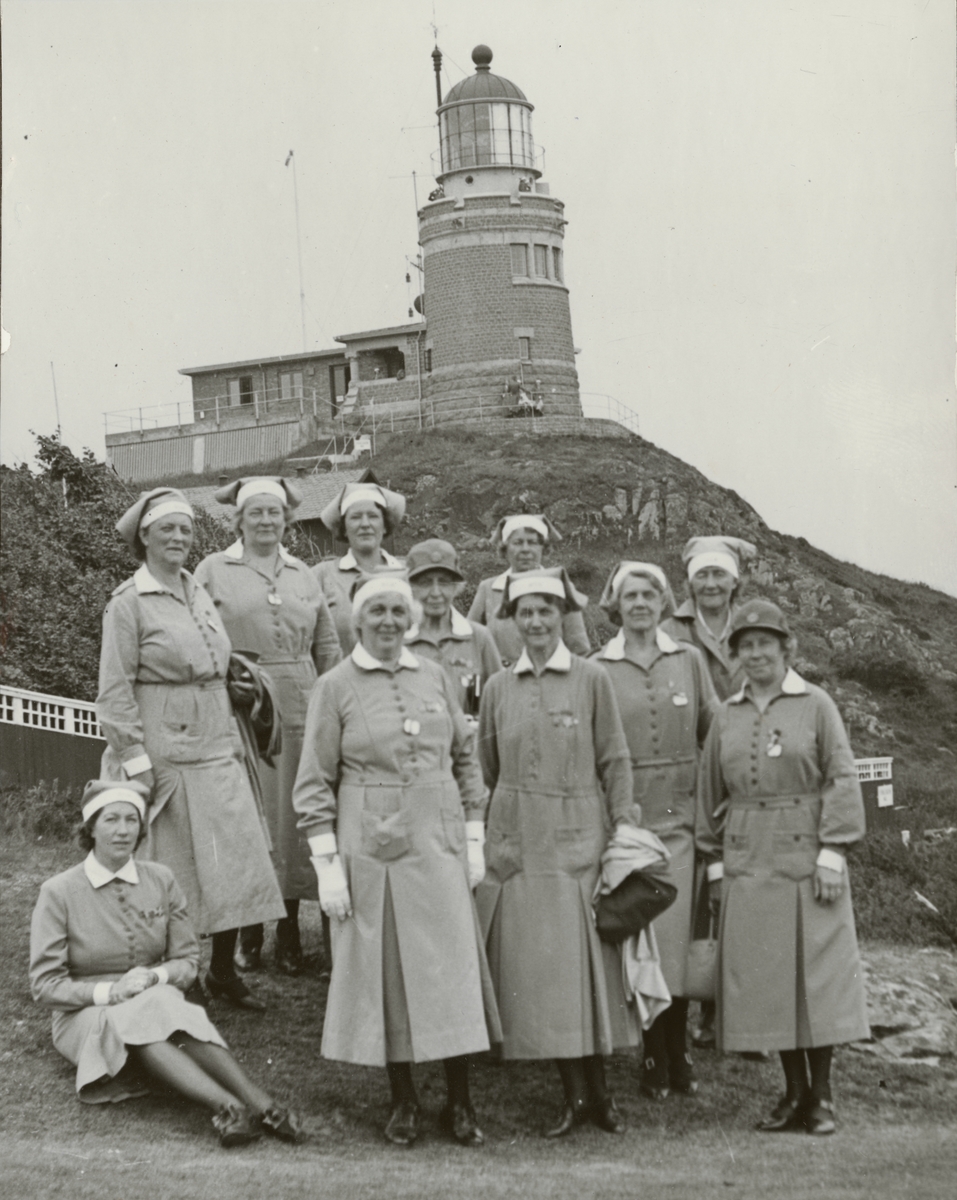 Titel: Lottor framför Kullens fyr i Höganäs under Lottornas Riksmöte i Helsingborg 28.-30. juni 1939.