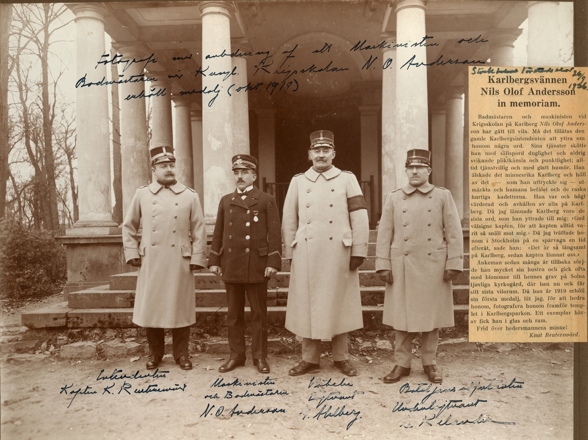Text i fotoalbum: "Fotografi med anledning af att Maskinisten och Badmästaren vid Kungl. Krigsskolan N. O. Andersson erhöll medalj (okt. 1919)".
