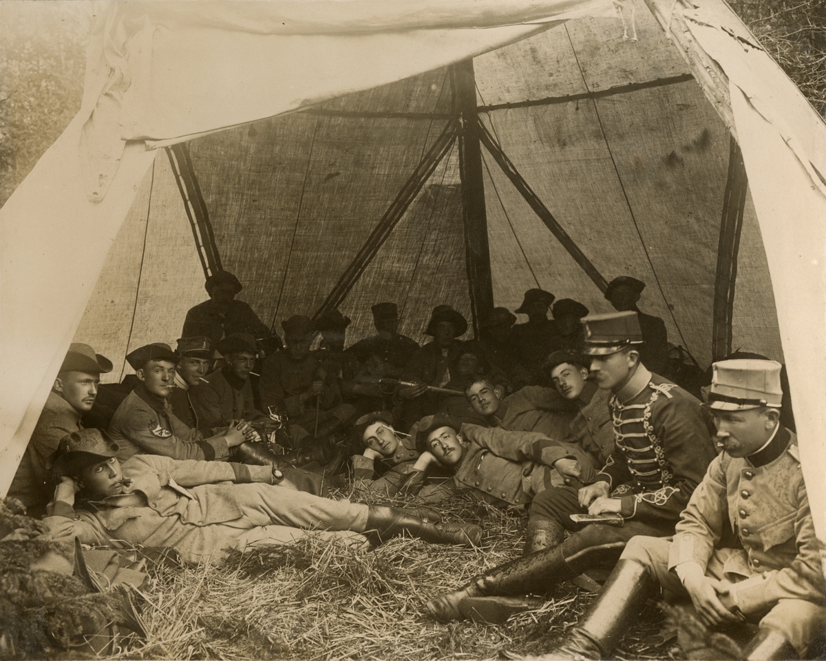 Titel: Gruppbild i tält med soldater från Kavalleriskolan i Umeå.